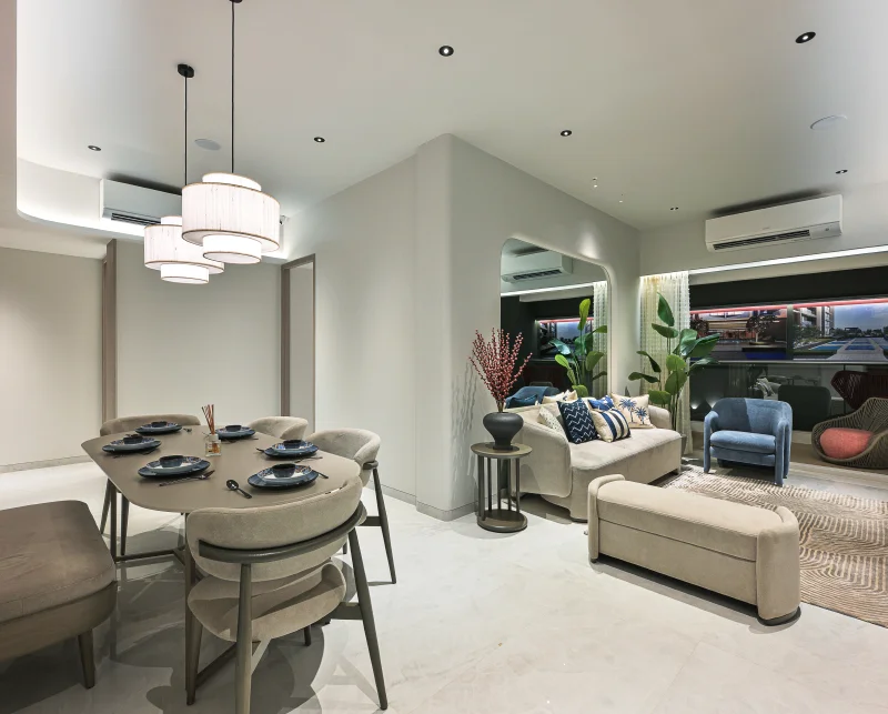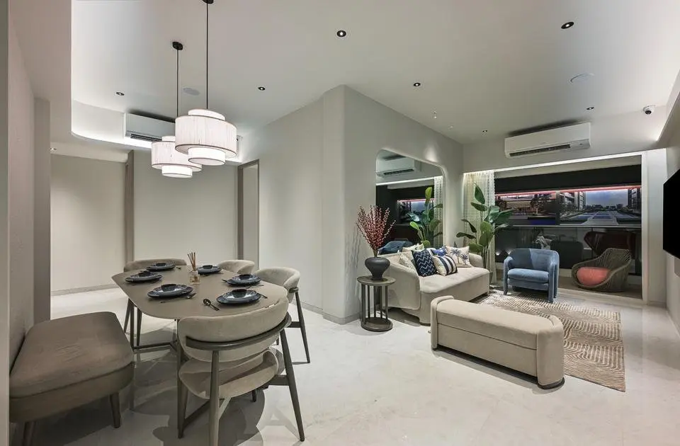 This thoughtfully designed living room flows effortlessly into a cozy dining area, while the attached balcony brings in just the right touch of sunlight and serenity.