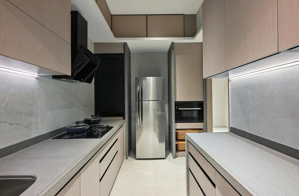 Every Acropolis-I residence begins with a warm, inviting foyer that opens into a bespoke kitchen adorned with premium stone countertops, engineered wood cabinetry, and seamless built-in accents, delivering both function and finesse.